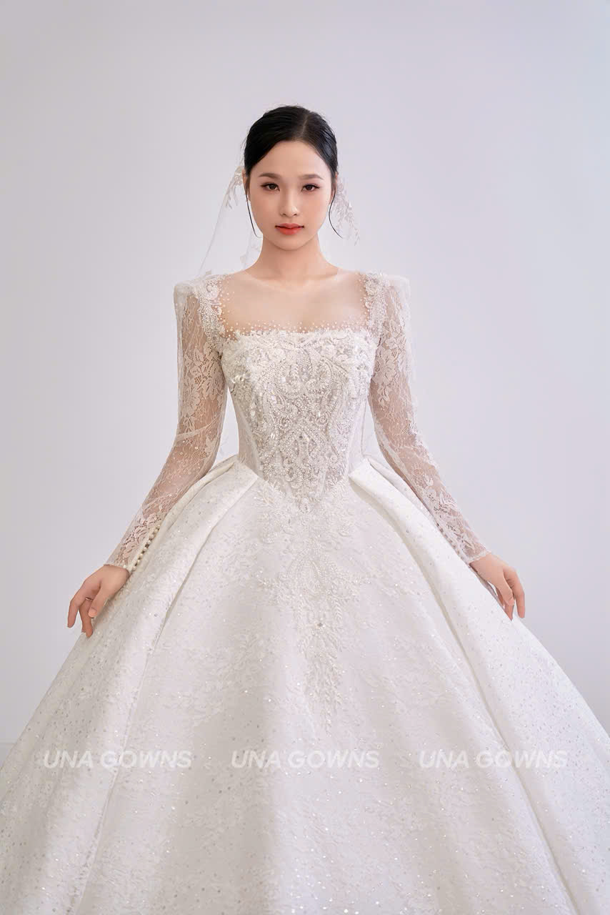 Toàn bộ thân váy được đính pha lê và hạt ngọc trai tỉ mỉ, tạo nên hiệu ứng bắt sáng lấp lánh nhưng không hề phô trương.
